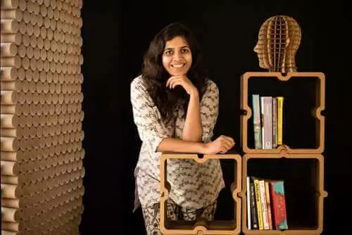 Sylvn Studio based in Bandana, is a design studio producing homes and furniture out of corrugated cardboard and recycled materials and integrates circularity with design sense. Her business involves rebuilding skills and training women artists, who sustain themselves and preserve the reclaimed material through creative and lasting items.